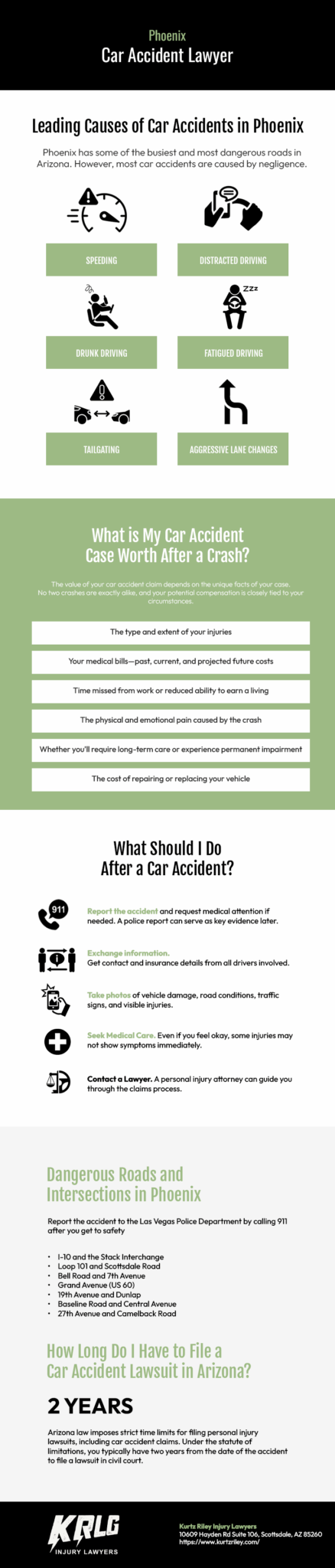 Were you injured in a car accident in Phoenix, AZ? If someone else caused the crash, you may be entitled to substantial compensation for your medical bills and other losses. Our Phoenix car accident attorneys at KRLG Injury Lawyers can help you pursue justice. Call us at (623) 303-5754 for a free consultation.